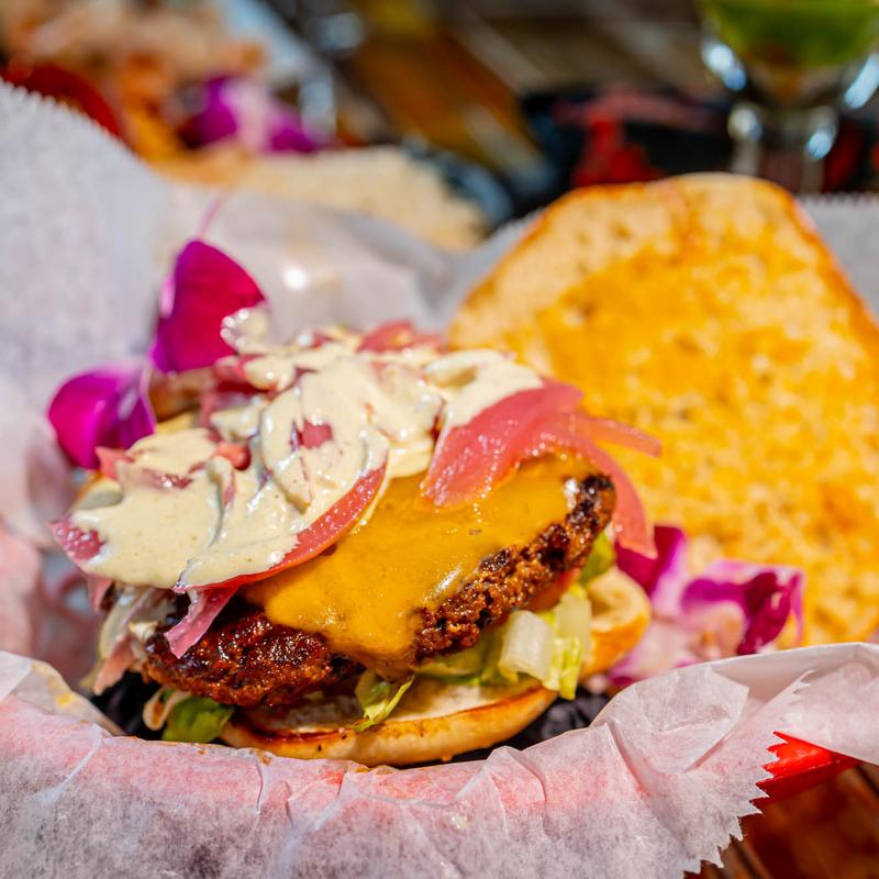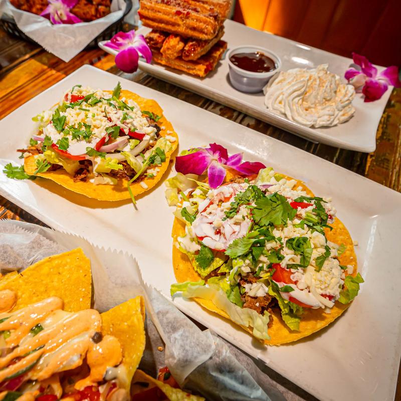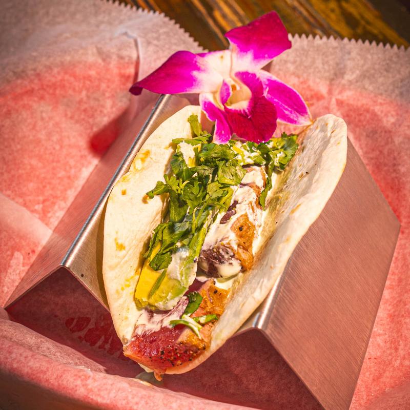 Grilled or blackened and topped with blended cabbage, melted cheese, fresh mango salsa, and our pink chili chipotle sauce.