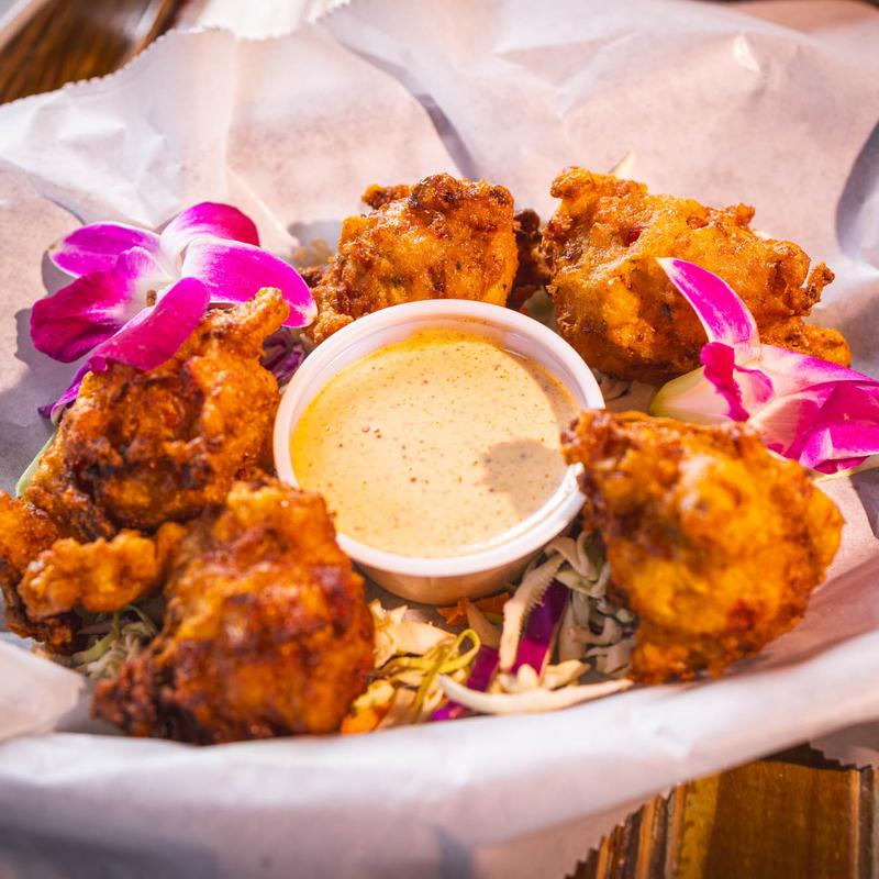 Homemade battered conch fritters. Served with a Dijon tartar sauce.