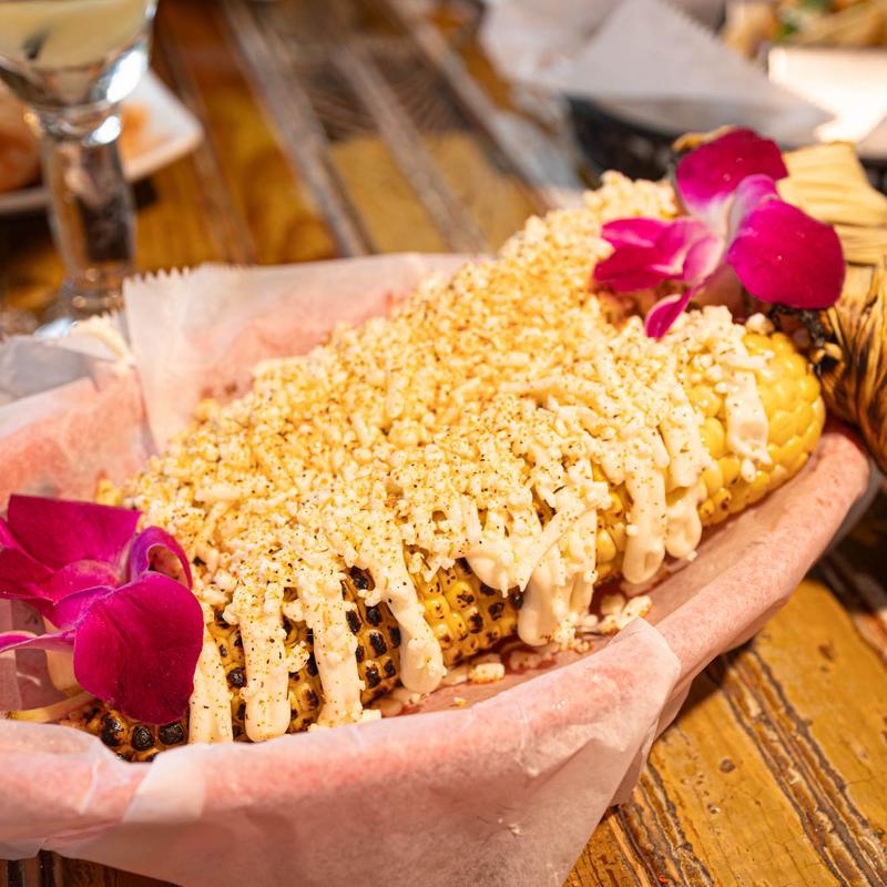 Beautifully grilled corn on the cobb smothered with butter, spices, Cotija cheese and mayonnaise.